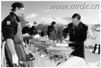 午餐時(shí)分,與會(huì)代表們紛紛裹緊外套,穿上大衣,離開暖氣燒得火熱的餐廳,來(lái)一頓戶外露天午餐。幕天席地與自然環(huán)境親密接觸,不失為親身體驗(yàn)氣候變化的好方法。但愿面對(duì)冰天雪地飽餐的同時(shí),代表們能思考出應(yīng)對(duì)氣候變化的更好辦法。