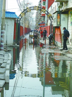 據(jù)居民介紹,西馬場(chǎng)北里只有這一條東西走向的胡同,居民出門(mén)、購(gòu)物都必須走這條路?涩F(xiàn)在路面每天汩汩往外冒臭水,人們只好用方磚沿著胡同北面鋪了一條窄路勉強(qiáng)通行,而現(xiàn)在那些方磚也被臭水淹沒(méi)了,居民通行更加困難。