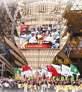 何鴻燊在首名火炬手手中接過火炬后,即在圣火護衛(wèi)隊簇擁下步前,有節(jié)奏地跑起來,而大批記者均撲前拍照,鎂光燈閃個不停,兩旁市民不斷歡呼,令何鴻燊精神抖擻地完成了200米的傳遞路程,將火炬交到第3名火炬手手上。
