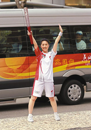 中新網(wǎng)5月4日電 據(jù)香港文匯報(bào)報(bào)道,楊千嬅是唯一一位香港演藝界代表負(fù)責(zé)澳門區(qū)的奧運(yùn)圣火傳送的火炬跑手,她傳遞的是第16棒,于3日下午4時(shí)15分左右跑200米路程,千嬅接棒時(shí)精神抖擻,笑容滿臉,但她起步卻跑得太快,要由身旁的保安人員提醒她要跑慢一點(diǎn)。事后千嬅大贊是光宗耀祖。