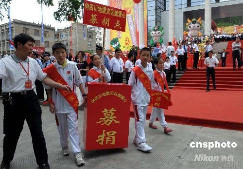 5月15日,奧運(yùn)圣火在江西井岡山傳遞,中學(xué)生在圣火所經(jīng)過的路線上布置募捐箱向四川災(zāi)區(qū)募集善款,沿途民眾紛紛響應(yīng)奉獻(xiàn)愛心。當(dāng)日,奧運(yùn)圣火傳遞提出“傳遞圣火奉獻(xiàn)愛心”的口號(hào)。 中新社發(fā) 廖攀 攝