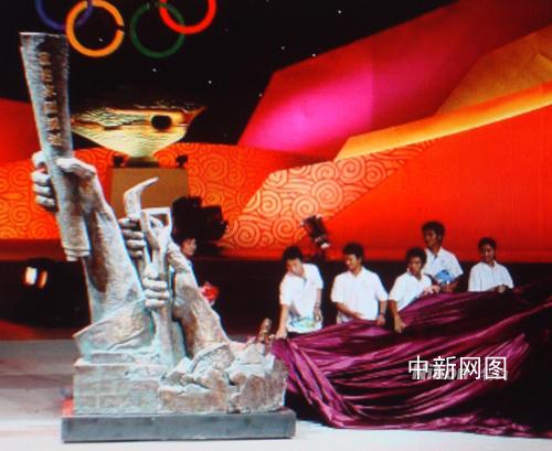 中新網(wǎng)北京6月2日電 (記者 賴海隆)5月31日晚,一尊名為“高擎圣火,克難興邦”的“5.12”大型紀(jì)念雕塑出現(xiàn)在“2008奧運(yùn)景觀雕塑方案征集大賽頒獎(jiǎng)活動(dòng)”現(xiàn)場(chǎng)。專程從重災(zāi)區(qū)趕來的十余名北川中學(xué)的幸存者與作者一起共同為此尊雕塑揭幕。這一象征中國(guó)人表達(dá)自強(qiáng)不息,重建家園,辦好奧運(yùn)決心的一幕,將現(xiàn)場(chǎng)氣氛推向了高潮。