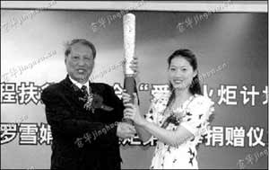 昨天上午,蛙泳皇后羅雪娟將北京奧運(yùn)會(huì)第一棒火炬捐贈(zèng)給中華思源工程扶貧基金會(huì),并正式出任該基金會(huì)“愛(ài)心火炬計(jì)劃”形象大使。