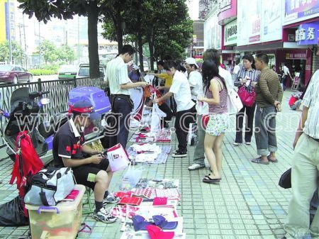 “奧運(yùn)主題T恤15元一件,紅旗4元一對(duì),紅色‘中國(guó)心’貼紙2元一版……”近幾日,記者在貴陽(yáng)市大十字、紫林庵、噴水池、師大等主要路段看到,有不少商家在路邊擺起了地?cái),奧運(yùn)小商品有T恤、印有“中國(guó)加油”的絲帶、黃色五角星的掛飾、小的五星紅旗等,吸引了不少市民駐足購(gòu)買(mǎi)。一位頭上扎著紅色絲帶,臉上貼著心形臉貼,手中揮舞著小國(guó)旗的河南商人告訴記者,“最近幾天生意都不錯(cuò),每天都能賣(mài)出100多件商品,其中小國(guó)旗是最好賣(mài)的!币晃徽谔暨x福娃T恤的韓先生對(duì)記者說(shuō),他前天已經(jīng)為他們一家3口買(mǎi)了3對(duì)國(guó)旗,想到奧運(yùn)圣火馬上要來(lái)貴陽(yáng)了,再來(lái)買(mǎi)3件“奧運(yùn)T恤”,這樣主要是表達(dá)自己對(duì)北京奧運(yùn)會(huì)的支持和期盼。