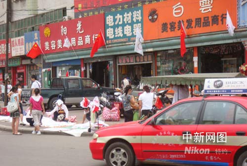 記者上午在運(yùn)城的街頭看到,各家商戶(hù)門(mén)面都懸掛奧運(yùn)彩旗,出租車(chē)、三輪車(chē)、摩托車(chē)等都自發(fā)的在車(chē)頭車(chē)尾插上彩旗。印有各色奧運(yùn)標(biāo)志圖案的文化衫火了運(yùn)城的一條街。