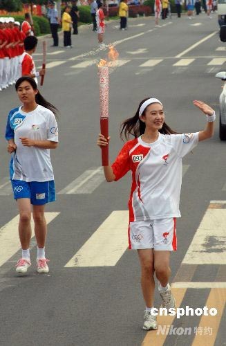 7月10日,奧運(yùn)火炬在內(nèi)蒙古赤峰進(jìn)行傳遞,漂亮的女大學(xué)生張萌作為赤峰火炬手傳遞奧運(yùn)火炬。中新社發(fā) 廖攀 攝