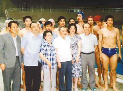 1990年7月3日,鄧小平視察北京亞運村后,在游泳館看望中國水球隊運動員。