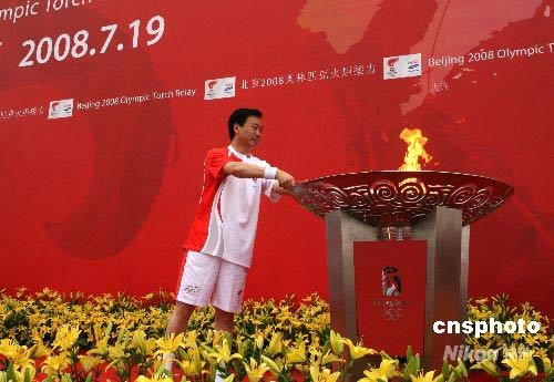 7月19日,隨著最后一棒火炬手、大連市市長夏德仁點燃圣火盆,北京奧運火炬圓滿結(jié)束了在大連的傳遞。 中新社發(fā) 周兆軍 攝