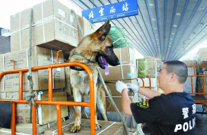 今天上午10時,記者在北京西站行李房看到,5名訓導員帶領(lǐng)5條警犬對所有托運的行李進行安全檢查。其中3名男民警帶領(lǐng)黑色和淺黃色的拉布拉多犬,而首次出場的女訓導員帶領(lǐng)黃色帶棕色斑點的史賓格犬。女警們身穿黑色的警服T恤,黃色的袖標上面印有盾牌,貼著“搜爆”標志,女警們個個顯得英姿颯爽。一名23歲年輕漂亮的女警魯卓鼓勵了一下自己的愛犬——1歲多的搜爆犬杰瑞,發(fā)出“搜”的一聲指令,杰瑞立即順著女訓導員手指的方向躥向了旁邊的一排大行李箱,努力嗅了起來。一直工作了三四十分鐘,杰瑞在行李房沒有發(fā)現(xiàn)可疑物品,又回到了魯卓的身旁。魯卓向警犬表示了友好,好好地鼓勵了它一下。