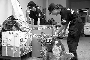 民警介紹,男訓(xùn)導(dǎo)員攜帶的是拉布拉多警犬,女訓(xùn)導(dǎo)員帶的是小型帶斑點(diǎn)的史賓格犬,更容易被控制,而且不像大型犬那樣會(huì)嚇著旅客。為給搜爆犬在上崗前穿上黑色網(wǎng)格的“警服”,幾名訓(xùn)導(dǎo)員頗費(fèi)周折才將它們制服。