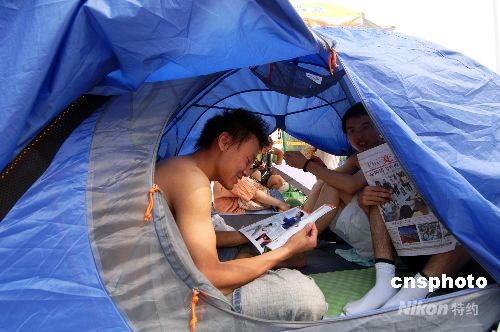 7月24日下午,北京的大學(xué)生搭著帳篷冒酷暑等待購(gòu)買最后一批奧運(yùn)門票。奧運(yùn)第四階段門票銷售即將于25日正式開(kāi)始,24日一大早就有大批民眾前往等候買票。中新社發(fā) 王東明 攝