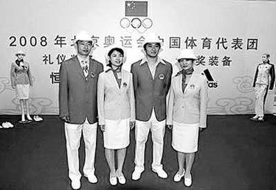 在昨天上午舉行的奧運(yùn)村開村儀式上,由恒源祥設(shè)計制作的中國奧運(yùn)代表團(tuán)禮服,首次在公眾場合亮相。男運(yùn)動員是鮮紅的西裝內(nèi)襯鵝黃襯衫,五環(huán)圖樣烙上領(lǐng)帶;女運(yùn)動員則是鵝黃貼身短西裝配白色一步裙,系的是祥云絲巾……看慣了運(yùn)動明星們一身休閑裝打扮,突然轉(zhuǎn)換形象,倒也讓人感覺眼前一亮。
