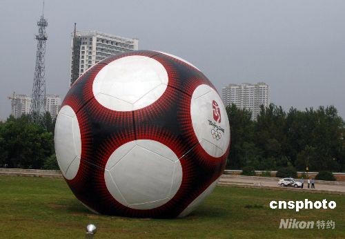 7月30日,秦皇島市區(qū)內巨大的足球雕塑。當日,奧運火炬在河北省秦皇島市進行傳遞。秦皇島是北京奧運會足球比賽分賽場之一。 中新社發(fā) 廖攀 攝
