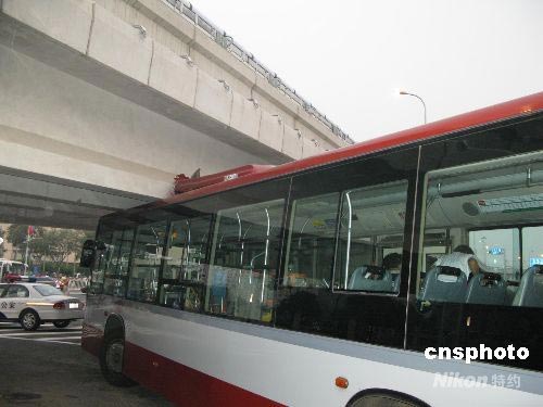 30日晚,記者目擊了北京奧運(yùn)開幕式彩排前發(fā)生的一樁交通意外。7點(diǎn)10分,一輛調(diào)度觀眾的公交車,在從鳥巢東門運(yùn)送觀眾前往鳥巢其他入口時(shí),車行至四環(huán)橋引橋下,因公交車司機(jī)誤從小車拐彎道拐彎,車身過高,撞到鳥巢東門右側(cè)的四環(huán)引橋上,現(xiàn)場(chǎng)發(fā)出巨大響聲,五百米外清晰可聞,車頂撞壞。車身卡在橋下,幸車上只有四五名觀眾,無人受傷。圖為卡在橋下的公交車。 中新社發(fā) 吳慶才 攝