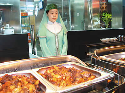 納賽爾剛剛走進(jìn)又一順飯莊,目光就被身著淡綠色伊斯蘭裝的服務(wù)員所吸引!八齻兊囊路秲浩痢!睘橘e客遞送餐具的時(shí)候,服務(wù)員楊晴的臉上一直掛著甜甜的微笑!拔覀兌Y拜帽上的紗巾,在阿拉伯國家是婦女蒙面用的,這樣的設(shè)計(jì)更加貼近了他們的風(fēng)俗。”
