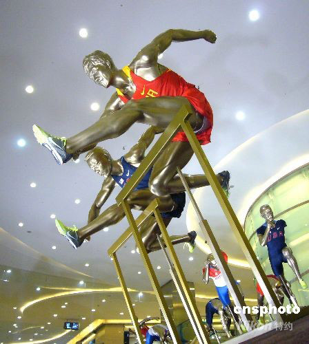 8月4日,隨著北京奧運(yùn)的臨近,王府井東方新天地開始展示各類體育運(yùn)動的人物形象,其中“劉翔跨欄”的瞬間成為商場內(nèi)最引人注目的焦點(diǎn)。中新社發(fā) 玉龍 攝