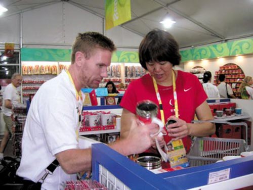 結(jié)果,廣東姑娘謝杏芳買了一大箱子的福娃茶盅,每個小小的茶盅上都有福娃頭像,一套72件。不用說,林丹提著。這下只能提前收工了,林丹迅速提了兩套福娃玩偶,還有帽子,小玩意兒,“明天再來吧!彼f。收銀臺一算:2141元。謝杏芳掏出銀行卡,不料收銀員說:“只收VISA!编福l讓這里是奧運(yùn)村呢。謝杏芳掏出錢包,現(xiàn)金沒帶夠,有點(diǎn)兒尷尬。這時(shí)候老帥湯仙虎上場了,他打開錢包,爽快地替弟子付了錢。此時(shí)的林丹,倒不是“不接翎子”,是真給人拖住簽名去了。