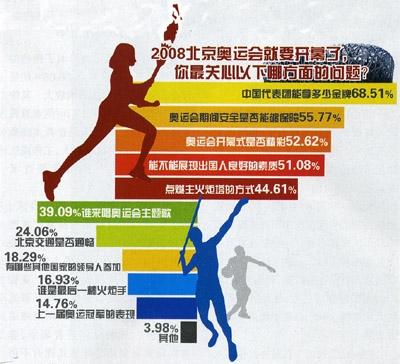 本次問卷調(diào)查結(jié)果顯示,群眾最擔(dān)心的問題,排在前三位的是:“奧運(yùn)文明風(fēng)一吹而過”(2668票,占總59.29%)、“奧運(yùn)期間一些好的政策難以持續(xù)”(2081票,占總46.25%)、“國際社會對北京奧運(yùn)會的評價(jià)不高”(1654票,占總36.76%)。而對“奧運(yùn)之后經(jīng)濟(jì)發(fā)展速度放緩”、“辦奧運(yùn)可能入不敷出”、“北京的房價(jià)將大幅下跌”等問題,均占受調(diào)查者的35%以下。