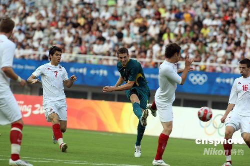 8月7日,北京奧運(yùn)會(huì)男子足球預(yù)賽A組,澳大利亞對(duì)塞爾維亞的比賽在上海體育場(chǎng)進(jìn)行。最終,澳大利亞1:1戰(zhàn)平塞爾維亞,雙方握手言和。圖為澳大利亞5號(hào)選手SPIRANOVIC Matthew在多位防守隊(duì)員包圍下起腳射門(mén)。中新社發(fā) 湯彥俊 攝
