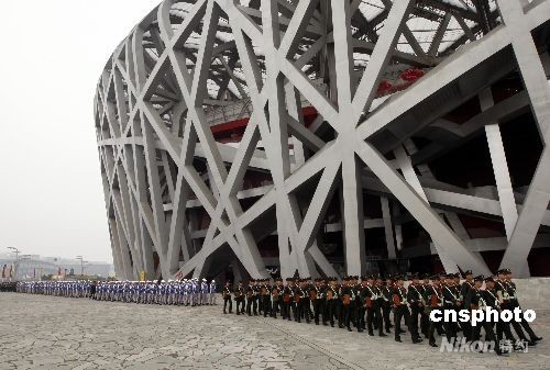 8月8日,第29屆夏季奧運(yùn)會(huì)將于當(dāng)晚在北京奧林匹克公園內(nèi)的國(guó)家體育場(chǎng)開幕,武警進(jìn)駐“鳥巢”周邊警戒崗位。中新社發(fā) 杜洋 攝