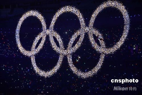 8月8日晚8時(shí)8分,第二十九屆夏季奧運(yùn)會(huì)在北京的國(guó)家體育場(chǎng)--鳥巢隆重開幕。五環(huán)圖案在北京“鳥巢”內(nèi)閃耀。中新社發(fā) 任晨鳴 攝