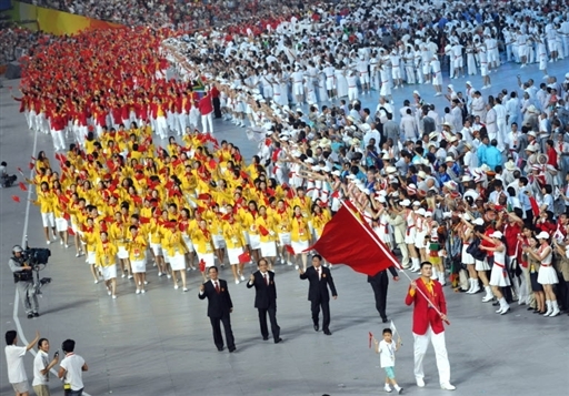 8月8日第29屆奧運(yùn)會開幕,中國代表團(tuán)入場,旗手為姚明,和姚明一同牽手進(jìn)入會場的是獲得英雄少年的光榮稱號的四川省阿壩州少年。