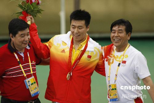 8月9日,北京奧運會射擊比賽男子10米氣手槍決賽在北京射擊館結束,中國隊22歲河北小將龐偉(中)獲得冠軍。圖為頒獎結束后,龐偉與教練王義夫(左)、陳繼元(右)合影,分享奪冠的喜悅。中新社發(fā) 盛佳鵬 攝
