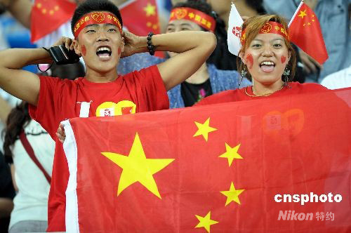 圖:中國球迷現(xiàn)場為女足姑娘們加油助威