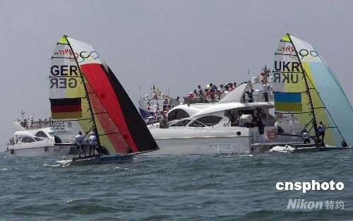 北京2008奧運帆船比賽8月10日繼續(xù)在青島舉行,觀眾乘豪華游船近距離觀看比賽。 中新社發(fā) 趙振清 攝