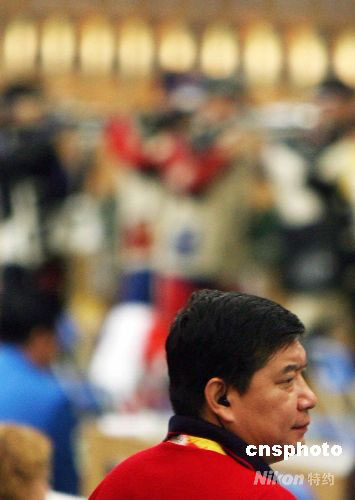 8月11日上午,中國選手朱啟南、曹逸飛爭奪北京奧運會男子10米氣步槍決賽權。中國射擊隊總教練王義夫現(xiàn)場觀戰(zhàn)。 中新社發(fā) 武仲林 攝