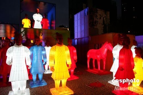 北京CBD內(nèi)充滿時尚感的世貿(mào)天階奧運文化廣場上,102尊兵馬俑彩燈擺出氣勢恢弘的陣形。不是遠自秦朝的陶土塑就,它們周身光彩奪目;不是身披鎧甲充滿殺氣,它們攜老扶幼,盡顯家庭歡樂。一個個燈彩透著歷史的深邃,也投身于眼前的奧運狂歡。從即日起至8月24日,他們將以特殊的方式為人們講述中華文化的源遠流長。中新社發(fā) 富田 攝