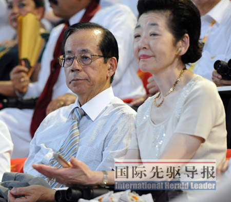 國際先驅(qū)導(dǎo)報特約撰稿吳林發(fā)自北京 8月8日的北京奧運會開幕式上,當(dāng)手持中日兩國國旗的日本奧運代表團進場時,坐在元首區(qū)的日本首相福田康夫和夫人福田貴代子隨即起身,向他們揮手致意。