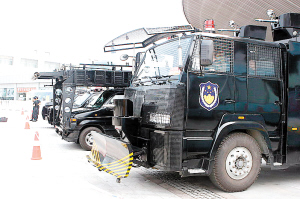 目前,本市(天津)特警300余人24小時護(hù)衛(wèi)奧運會天津賽區(qū)安全。昨天,記者探訪了在水滴實施護(hù)衛(wèi)的特警突擊車、裝甲車、運兵車和水炮車。