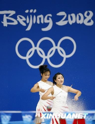 8月16日,演員們在游泳比賽開始前進行水鼓表演。