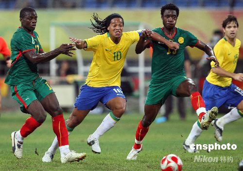 8月16日,北京奧運(yùn)會(huì)沈陽足球分賽場舉行男足1/4決賽,巴西隊(duì)通過加時(shí)賽,以2:0戰(zhàn)勝喀麥隆隊(duì),進(jìn)入半決賽。圖為巴西隊(duì)球員羅納爾迪尼奧(左二)帶球突破。中新社發(fā) 張宇 攝