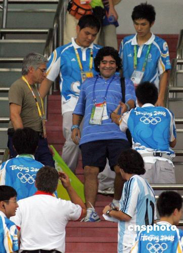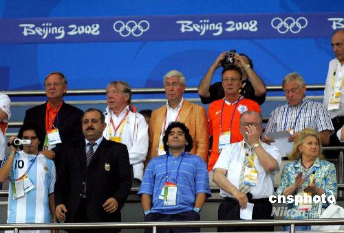 8月16日,北京奧運(yùn)會男足,阿根廷VS荷蘭的比賽在上海體育場進(jìn)行。球王馬拉多納親臨上海為阿根廷加油助威。中新社發(fā) 湯彥俊 攝