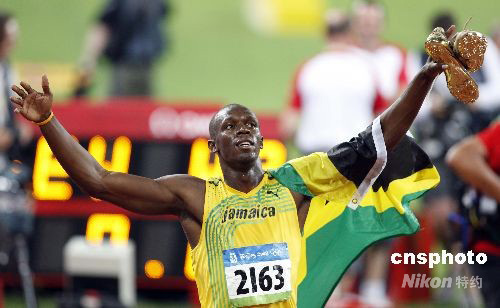 8月16日,牙買加選手尤塞恩·博爾特在國家體育場“鳥巢”進(jìn)行的北京奧運會男子100米決賽中以9秒69的成績奪得金牌并打破9秒72的世界紀(jì)錄。中新社發(fā) 盛佳鵬 攝