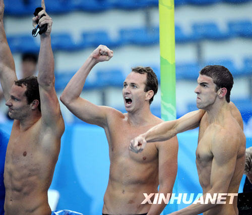 8月17日,菲爾普斯領(lǐng)銜的美國隊(duì)以3分29秒34的成績打破世界紀(jì)錄并奪得金牌。這是菲爾普斯繼男子400米個(gè)人混合泳、男子4x100米自由泳接力、男子200米自由泳、男子200米蝶泳、男子4x200米自由泳接力、男子200米個(gè)人混合泳和男子100米蝶泳之后,收獲的第八枚北京奧運(yùn)會(huì)金牌,打破前輩施皮茨在1972年慕尼黑奧運(yùn)會(huì)上創(chuàng)造的一屆拿七塊金牌的紀(jì)錄。 新華社記者 陳凱攝