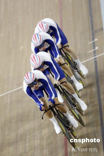 8月18日,北京奧運(yùn)會(huì)場(chǎng)地自行車男子4公里團(tuán)體追逐賽決賽在老山自行車館舉行,英國(guó)隊(duì)以3分53秒314的成績(jī)獲得金牌,打破世界紀(jì)錄。 中新社發(fā) 盛佳鵬 攝