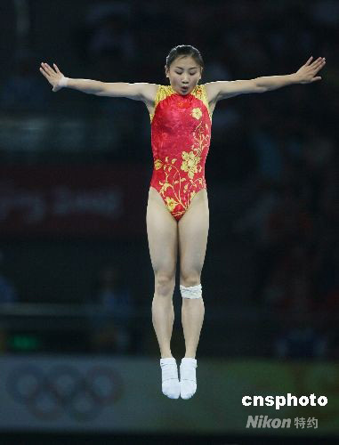 8月18日,中國選手何雯娜在北京奧運會女子蹦床比賽中以37.80分奪得冠軍。 中新社發(fā) 武仲林 攝