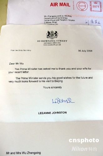圖:英國(guó)首相布朗回函中國(guó)“奧運(yùn)夫婦”