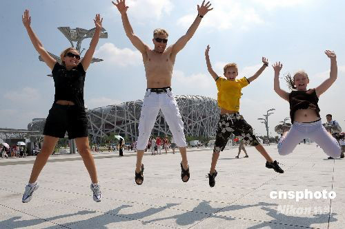 圖為外國(guó)游客一家人“鳥巢”外激情飛躍。