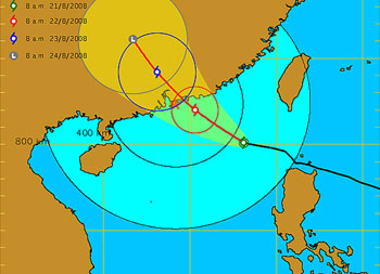 天文臺(tái)表示,在正午12時(shí),臺(tái)風(fēng)“鸚鵡”集結(jié)在香港的東南偏東約430公里,即在北緯20.3度,東經(jīng)117.7度附近,預(yù)料向西北或西北偏西移動(dòng),時(shí)速約14公里,大致趨向廣東沿岸。按照現(xiàn)時(shí)預(yù)測(cè)路徑,“鸚鵡”會(huì)繼續(xù)靠近香港。