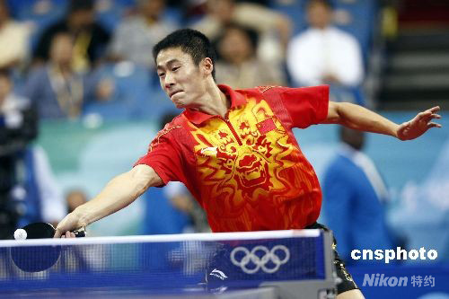 8月21日,北京奧運會乒乓球男子單打第三輪的比賽在北京大學體育館進行,中國選手王勵勤4比0戰(zhàn)勝波蘭選手盧希安·布拉什切克,晉級下一輪比賽。中新社發(fā) 盛佳鵬 攝