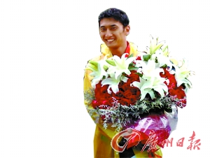 昨天,女子沙灘排球頒獎儀式在大雨中隆重舉行,之后三對獲獎選手陸續(xù)走過混合區(qū)。此刻,混合區(qū)外邊一個獨(dú)特的“景致”吸引了大家的注意:一個高大帥氣的小伙子手捧一束玫瑰,安靜地等待著。他正是田佳在八一沙排隊(duì)的隊(duì)友兼男友鄭鴻勇(見右圖),“本來不讓他來看比賽,不過到了16進(jìn)8的淘汰賽后他非得要來,那我就找來票給他,每次他都坐在我可以找到的地方!边@也揭開了大家的一個疑問,從淘汰賽開始,田佳每贏得一場勝利都會沖著觀眾席的某一個方向送出飛吻,原來,她是有“目標(biāo)”的。