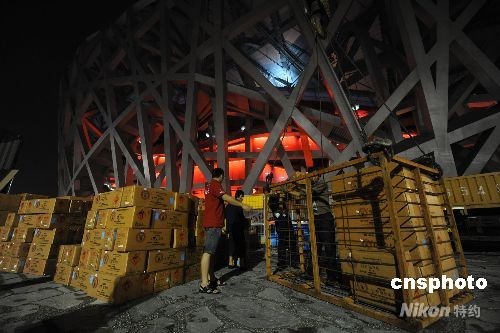 北京奧運(yùn)會(huì)閉幕式上的焰火表演將再次為世人奉獻(xiàn)一場(chǎng)華美的視覺盛宴。截止到八月二十二日下午,“鳥巢”煙花燃放已準(zhǔn)備就緒,屆時(shí)將為世人展現(xiàn)有別于開幕式的令風(fēng)姿。圖為負(fù)責(zé)煙火燃放的人員在鳥巢頂上安裝焰火。中新社發(fā) 鐘新 攝