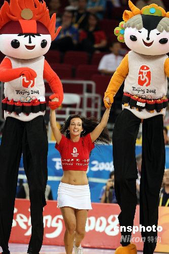北京奧運會男子籃球半決賽8月22日晚在五棵松籃球館開戰(zhàn),深受各國觀眾喜愛的北京奧運會吉祥物“福娃”表演踩高蹺為比賽助陣。中新社發(fā) 任晨鳴 攝