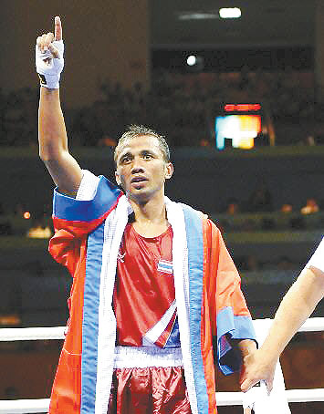 在今天的半決賽中,出場時的汶尊儂,沉穩(wěn)得像個書生。在以10∶5的大比分戰(zhàn)勝古巴選手伊格萊西亞斯后,有拳迷向他獻上祝賀的鮮花,他虔誠而又恭敬地雙手合十,表示感謝。