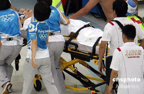 奧運會救護人員將日本隊昏厥運動員送往醫(yī)院。中新社發(fā) 任晨鳴 攝