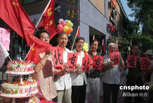 圖為紐約福建公所的幾位華僑,打出“北京北京我愛您”標(biāo)語(yǔ),驕傲之情溢于言表。